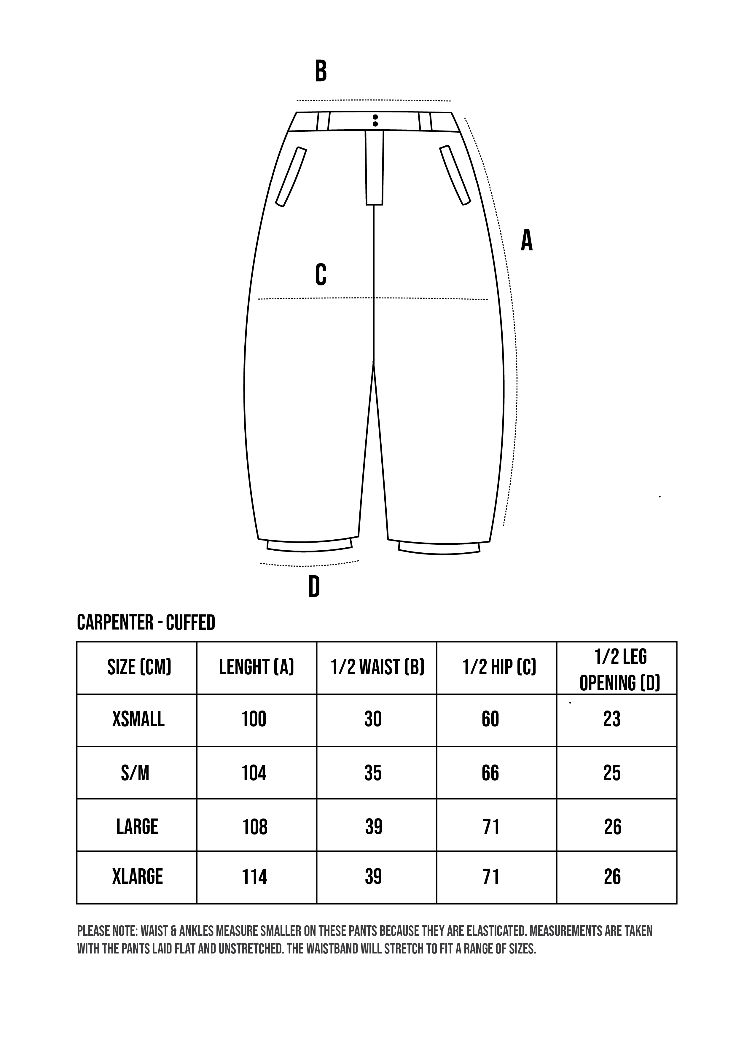 Pants - We recommend choosing your size based on your height. All pants have a drawstring and belt loops around the waist, and a drawstring at ankles, so can be adjusted to fit. Please make sure to check the ‘length’ on the size chart to make sure the pants will fit the length of your legs. Please note, our pants are supposed to sit on the hips (low to mid rise) rather than sit high waisted. All pants have a baggy fit.